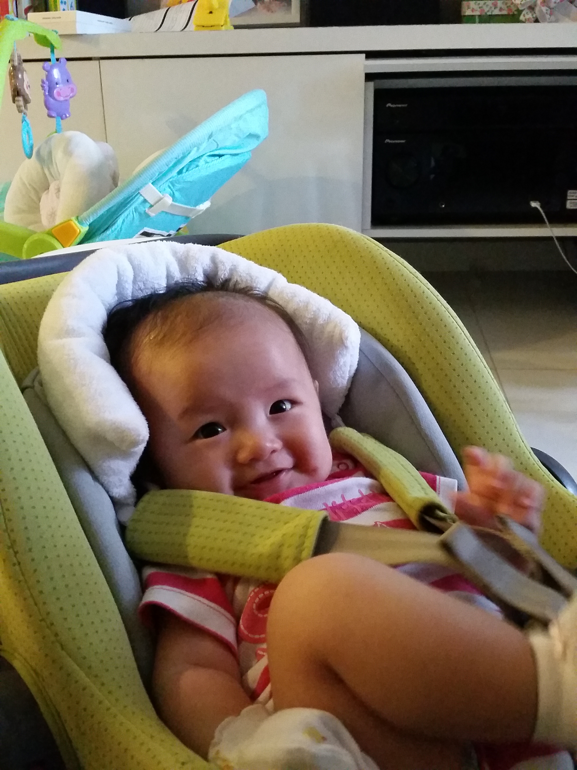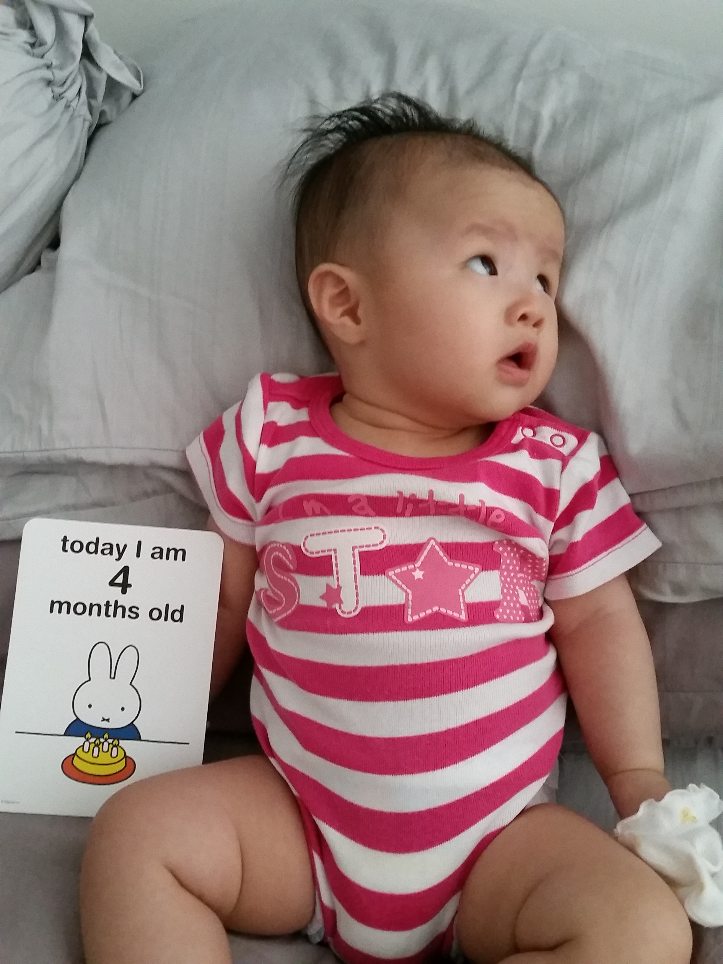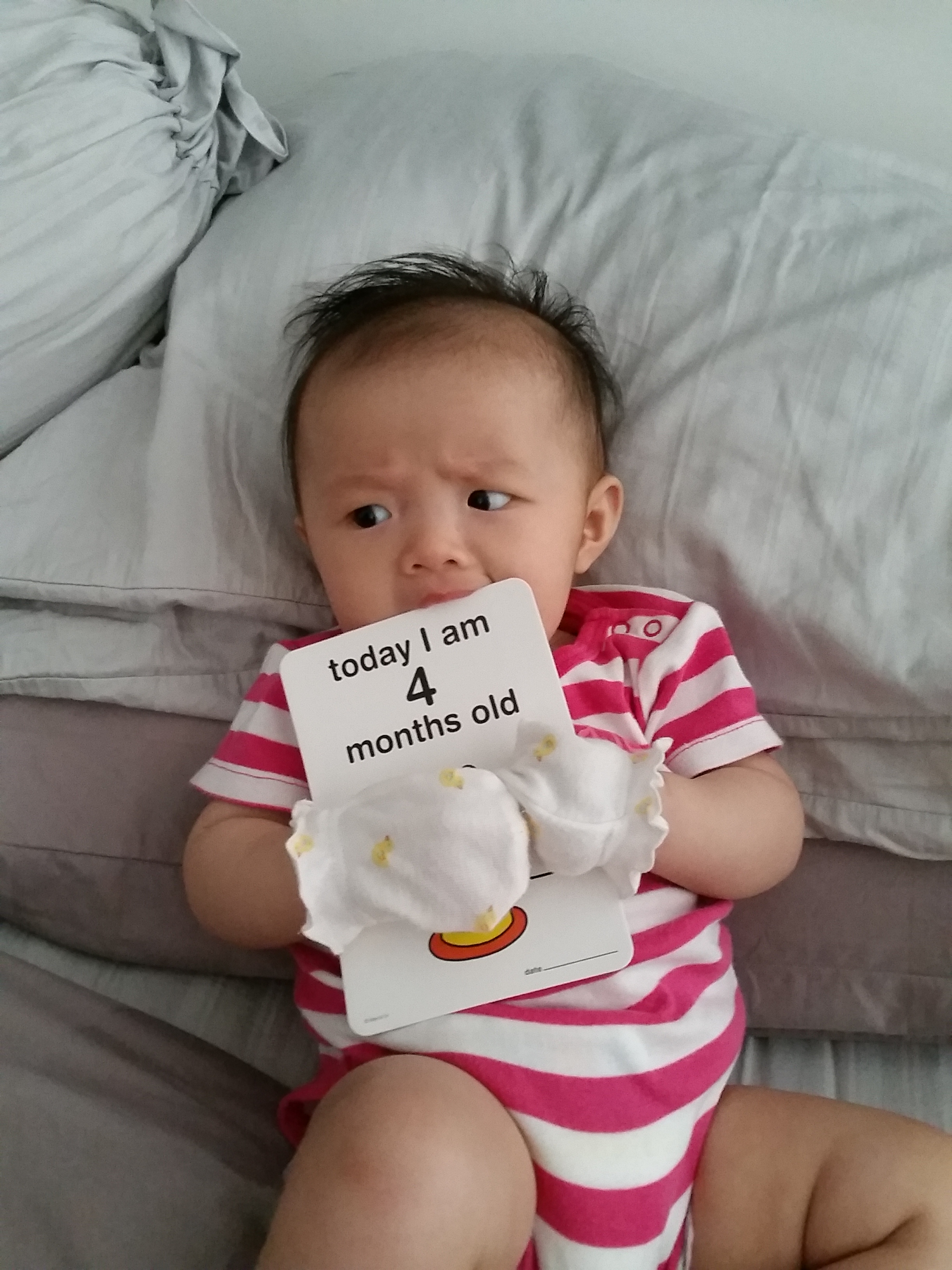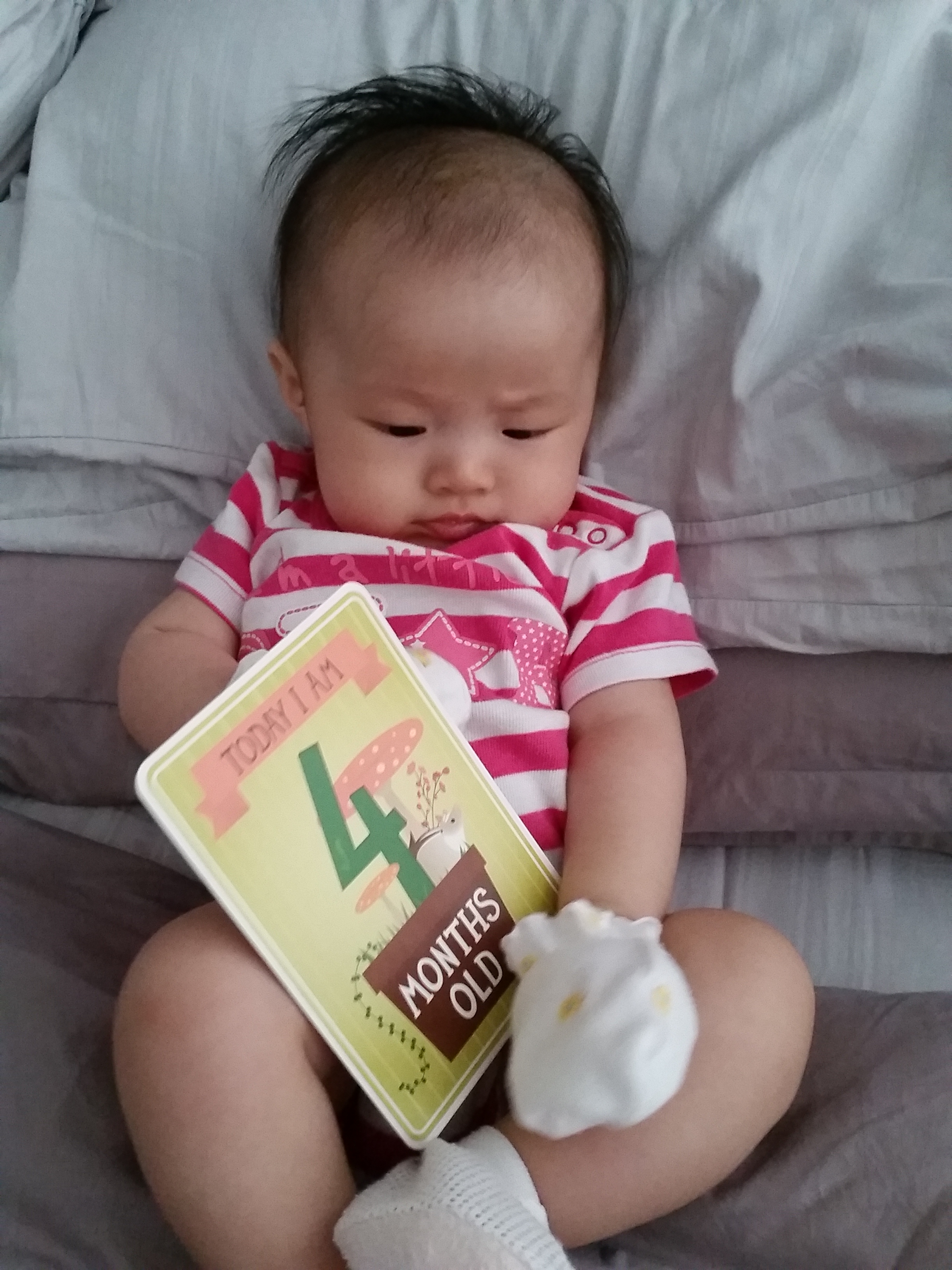 Four month old is a ripe young age yes. We’re not in a hurry for her to grow up. Her babyness is really like sand that is slipping through my fingers, but I’m overjoyed whenever she reaches a new milestone.