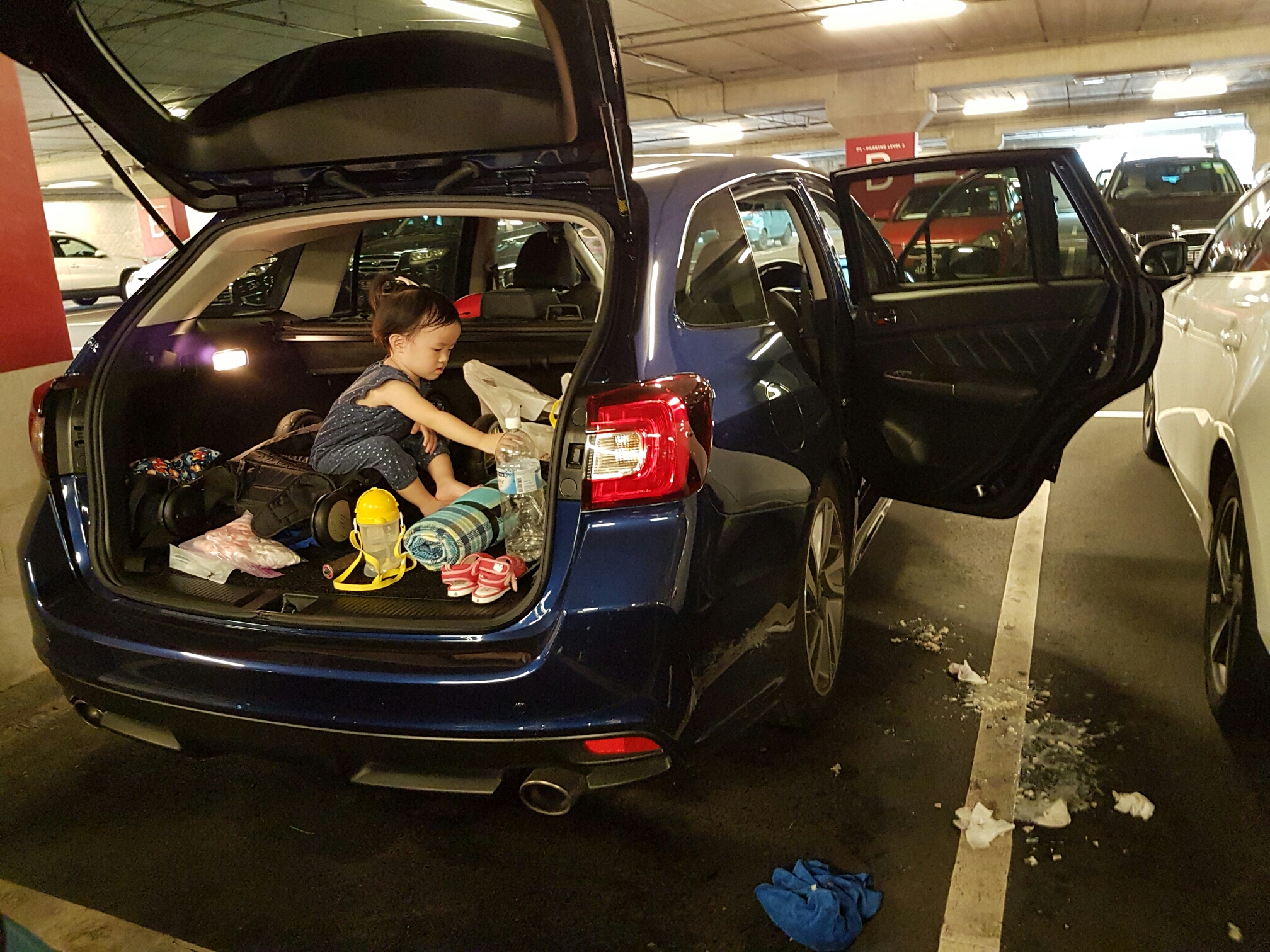 After an outing to Punggol settlement and a play session at BFF’s  place, we headed out in 2 cars to Ikea Tampines. Little Foot had been drinking green tea from the Hello Kitty Bottle, when the car was reversing… she suddenly made that oh-so-familar  face. Next thing we knew… she created a projectile inside the car….complete mayhem! Papa hurriedly got to us and carried her out where she vomited more. The seat and carpet inside our swanky new car…and my pants were the collateral damage. So we managed to clean our crying toddler up first. And parked her in the car boot while we waited for my bro and family to swing back to his house to get me spare pants. And waited for Papa to get some water  to try to clean the car. Luckily she was happily self-entertained by the 2 plastic bottles.