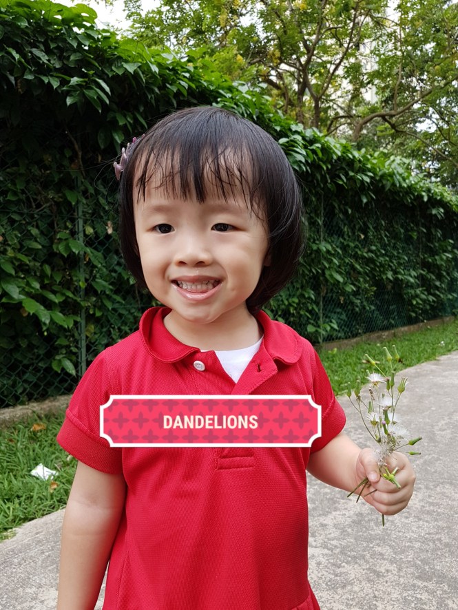 Unable to convince Little Foot to stay  on in school for the rest of the day, I walked her back to my parents’ place… and tried to interest her with nature. She loved it and we had a happy walk together. I showed her dandelions and mimosas, the little plants which my mum showed me when I was a child.